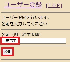 ユーザー登録画面が表示されるので、名前欄に氏名を入力して「送信」をクリック。